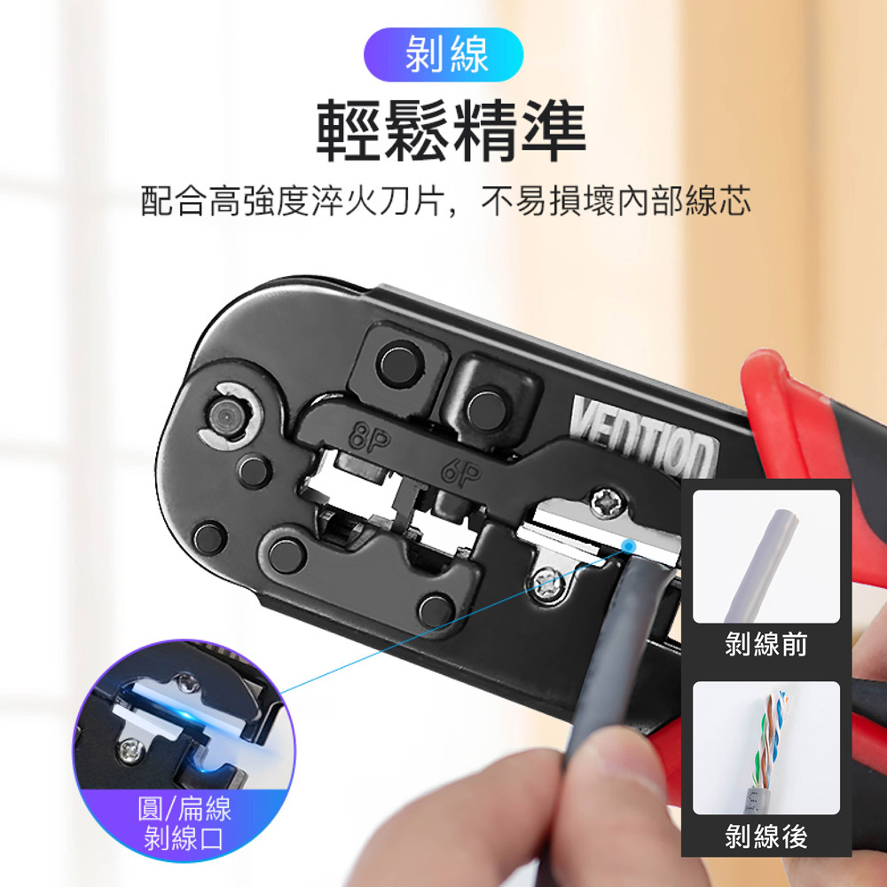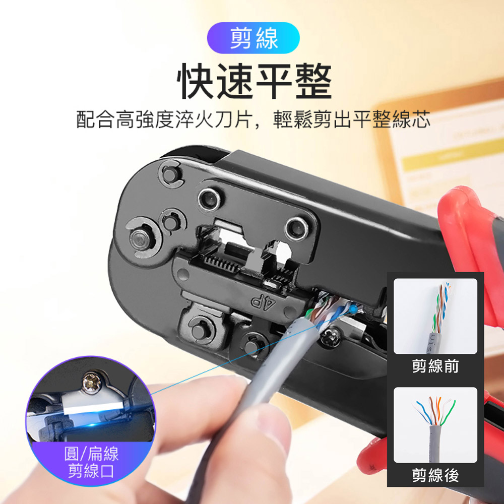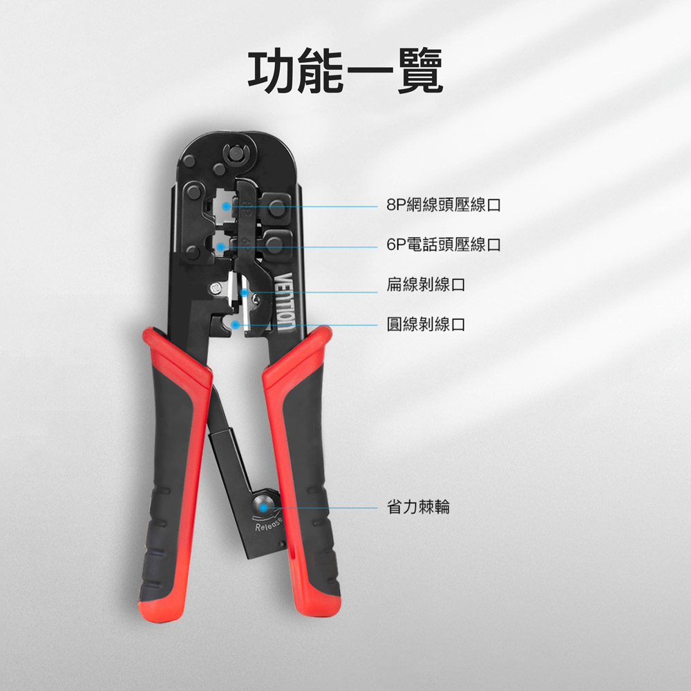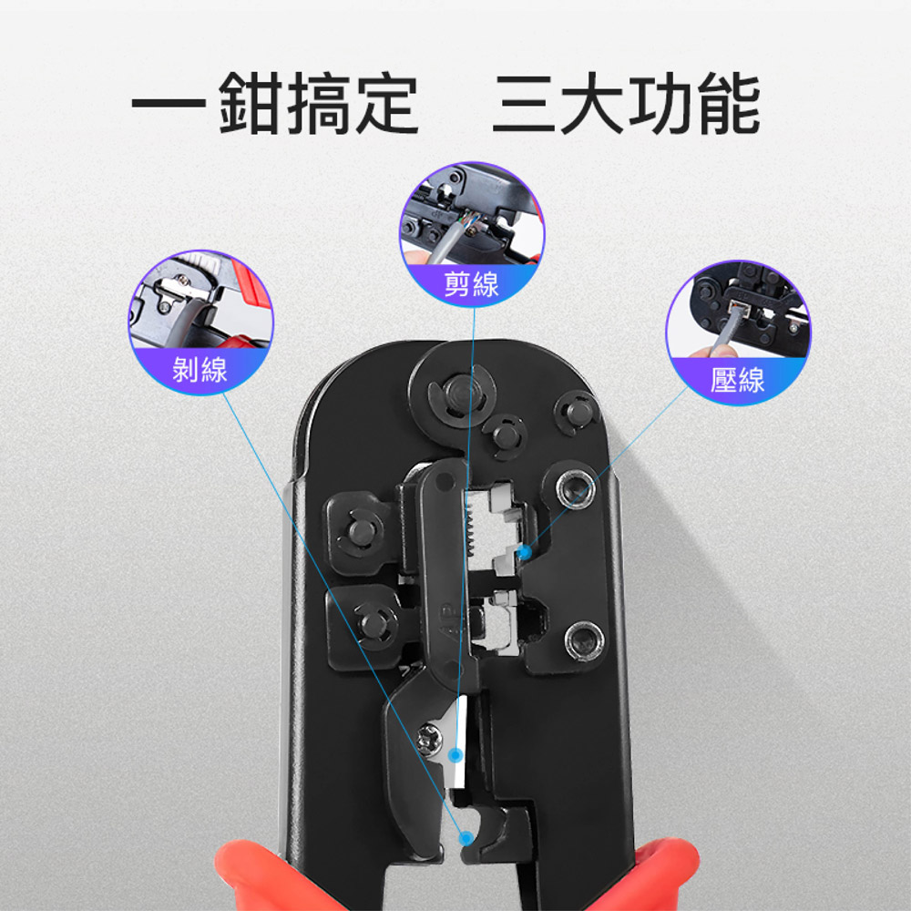 三合一功能設計-集結壓接、剝線、剪線功能於一體 棘輪結構,省力好操作 支援 RJ45(8P8C)、RJ12、RJ11(6P)、RJ9 等接頭類型,適用範圍廣 高硬度鋼材刀口 防滑握柄設計 精密壓接,不傷接頭 內建自動彈簧回彈機構 附帶壓接定位槽 可更換刀頭設計 刀口支援更換式設計,延長整體工具壽命,更加經濟實用