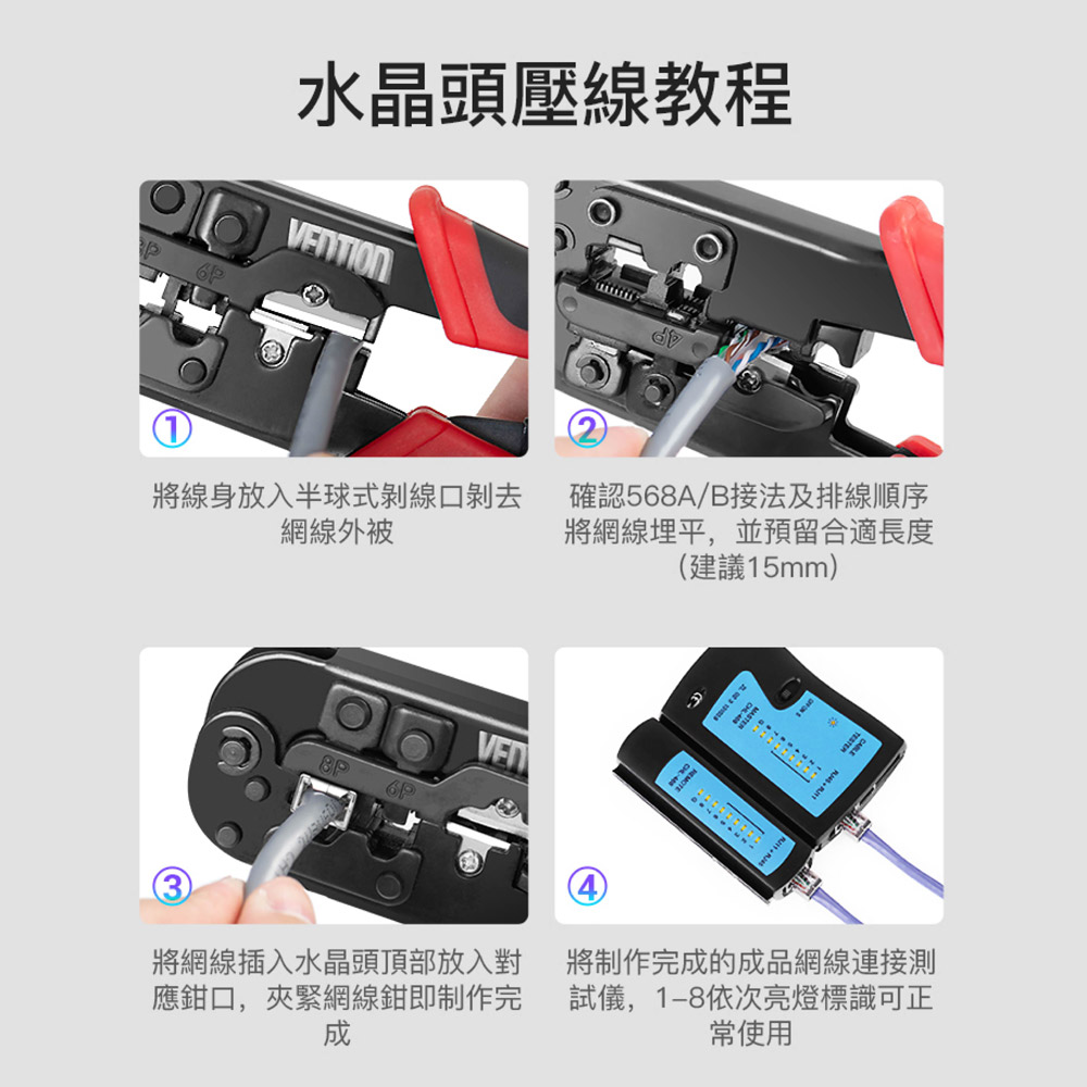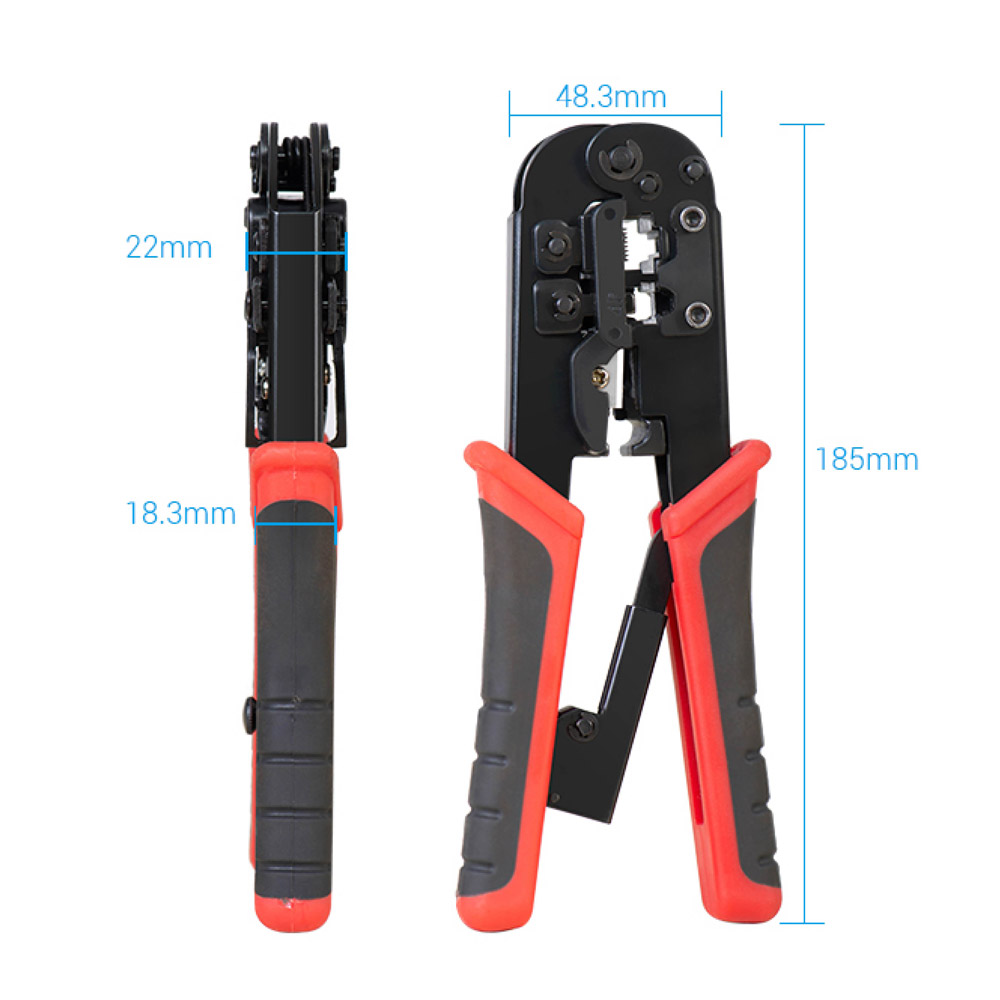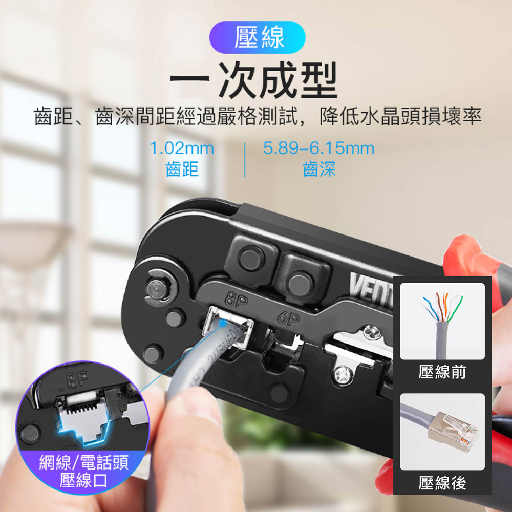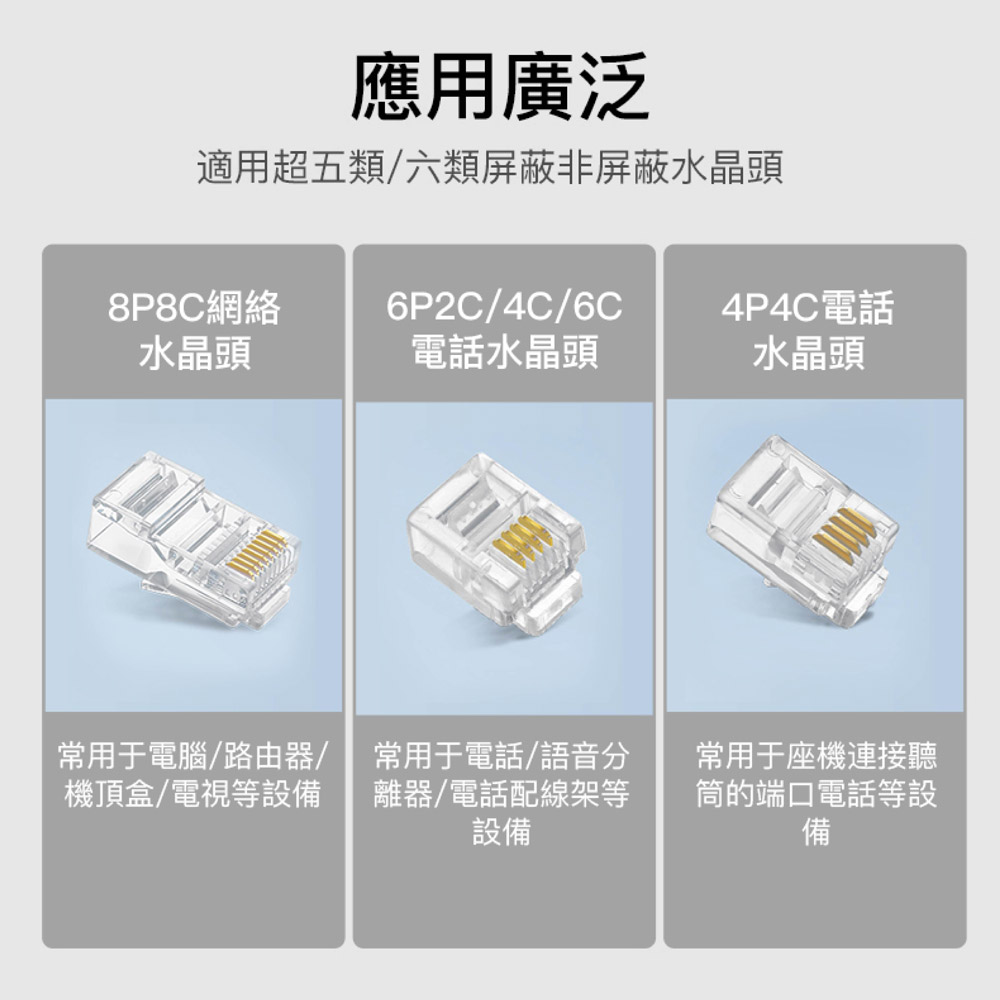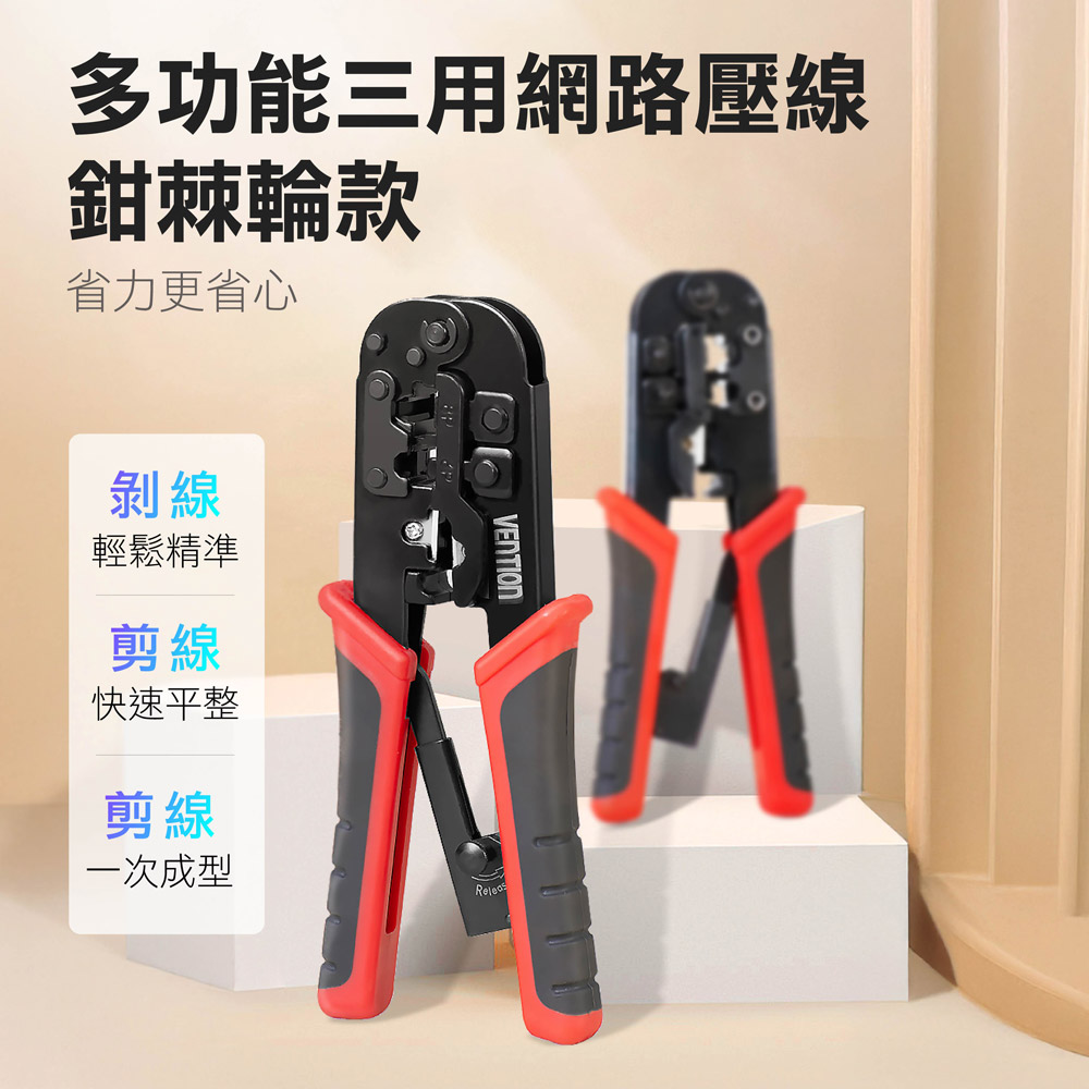 三合一功能設計-集結壓接、剝線、剪線功能於一體 棘輪結構,省力好操作 支援 RJ45(8P8C)、RJ12、RJ11(6P)、RJ9 等接頭類型,適用範圍廣 高硬度鋼材刀口 防滑握柄設計 精密壓接,不傷接頭 內建自動彈簧回彈機構 附帶壓接定位槽 可更換刀頭設計 刀口支援更換式設計,延長整體工具壽命,更加經濟實用