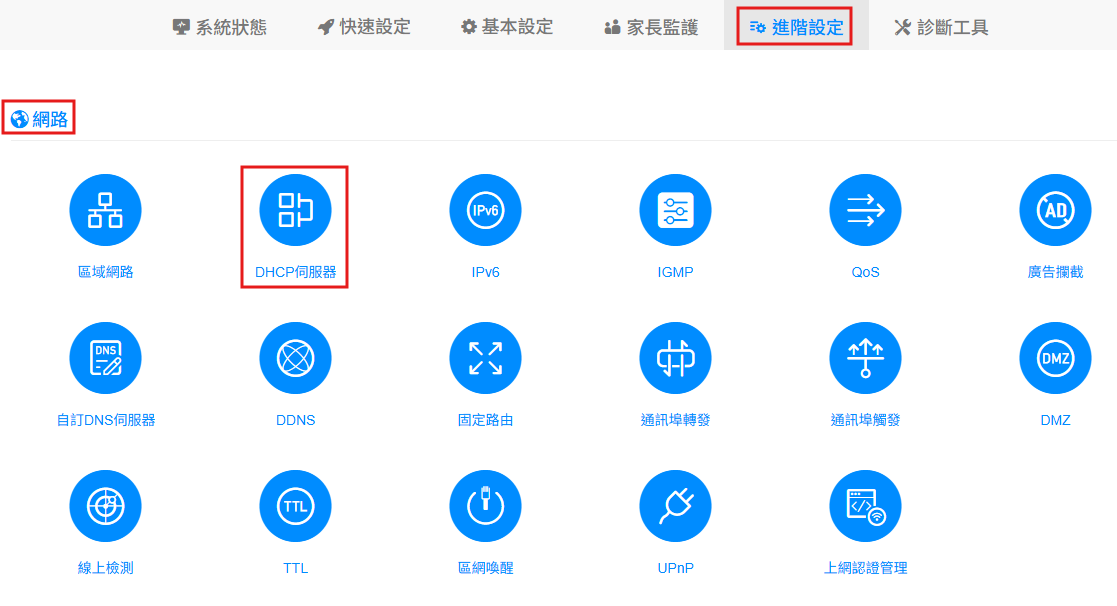 步驟 1: 進入「進階設定」 > 「網路」 > 「DHCP 伺服器」