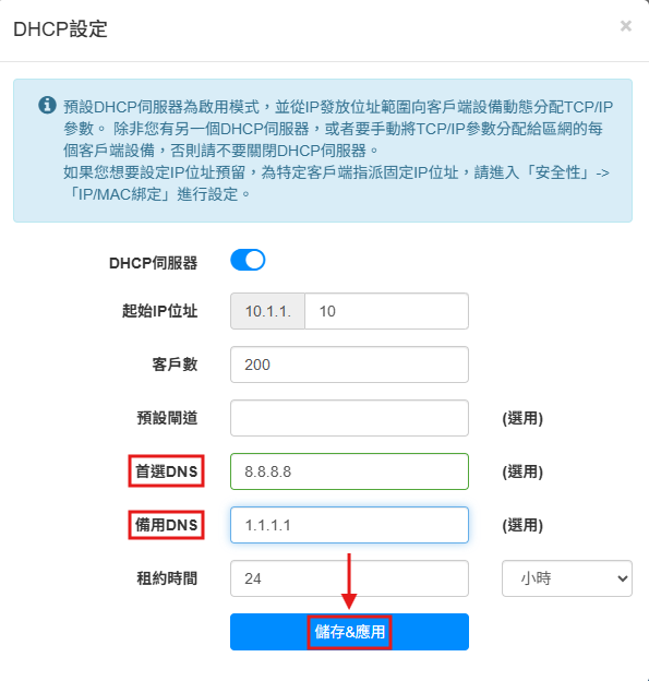 如果您只是想讓家中設備使用特定的 DNS 位址(如 8.8.8.8),請使用此項
