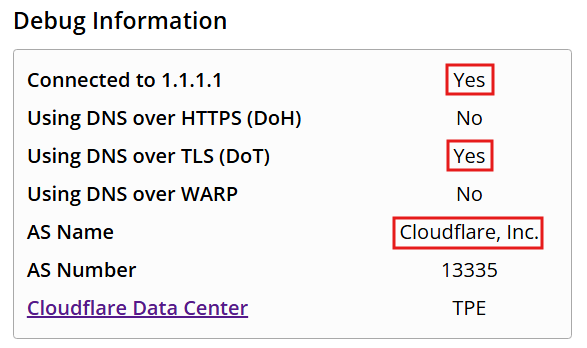 - Using DNS over TLS (DoT): 應顯示為 Yes,表示您的路由器加密成功