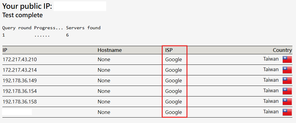dnsleaktest.com並執行 Standard Test,確認結果清單中的 ISP 僅顯示 Google