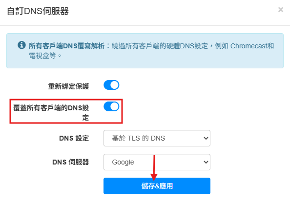 開啟後所有連上路由器的設備都強制使用路由器上的 DNS,避免單一設備自行設定造成的洩漏