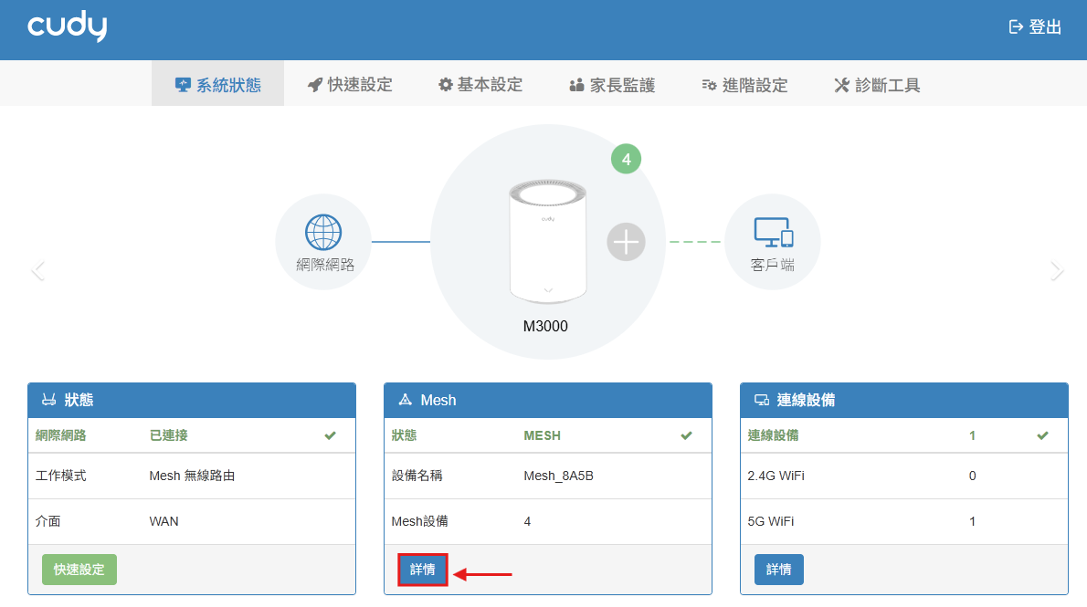 步驟 2: 進入「系統狀態」 -> 找到「Mesh 欄位」 -> 點選「詳情」