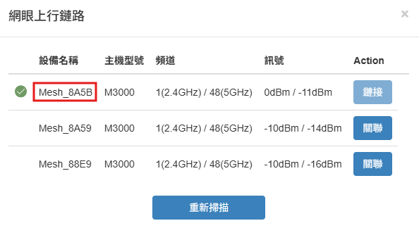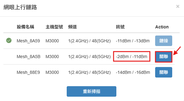 步驟 4: 可根據訊號強度來變更上行設備,點選目標設備旁的「關聯」