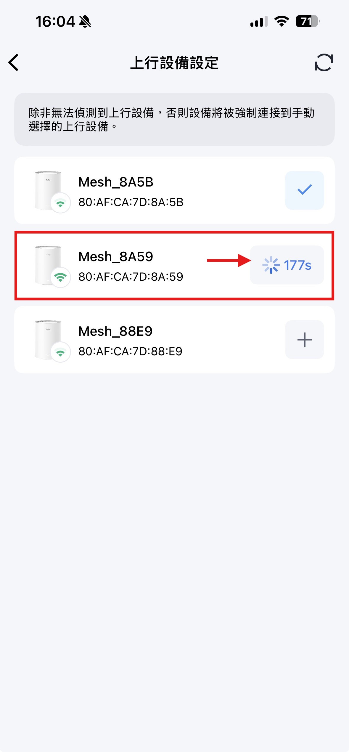 步驟 5: 您可以根據訊號強度來變更上行設備。點選目標設備旁的「+」號後即會重新設定,請等待約 3 分鐘即可完成