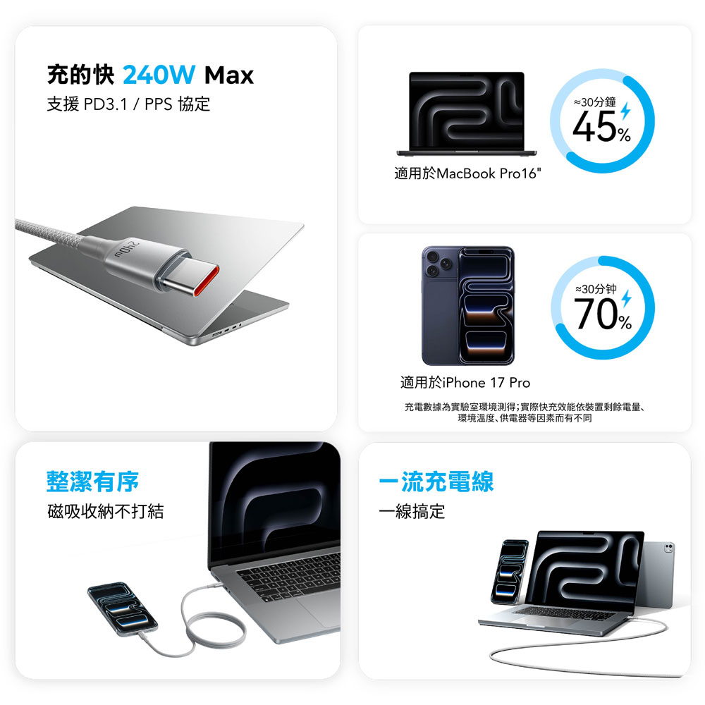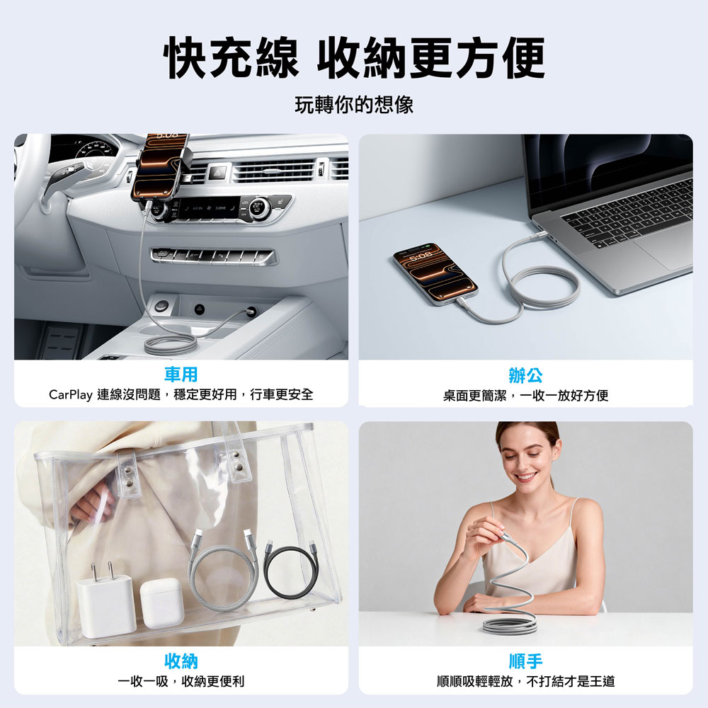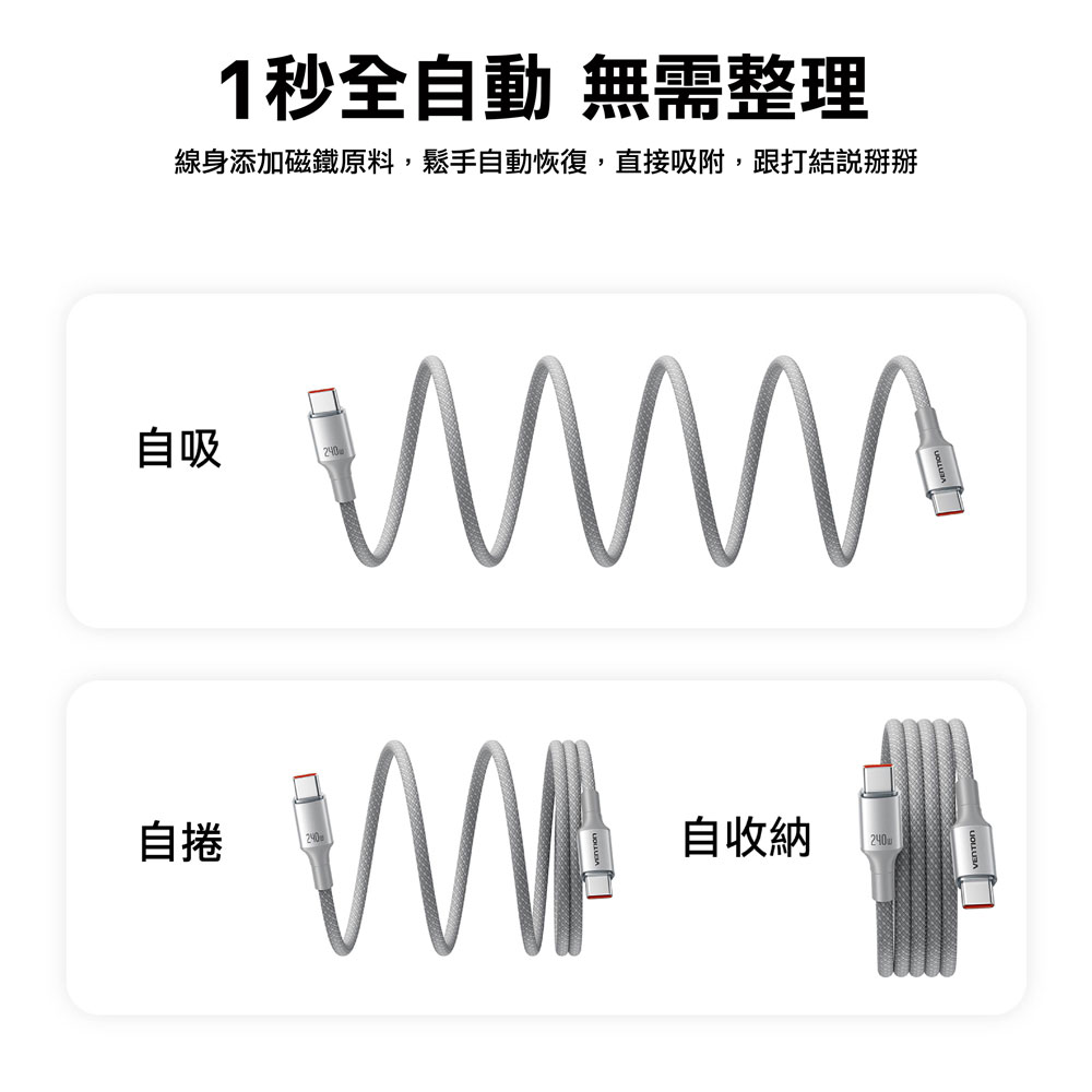 📌自動磁吸捲線,告別雜亂纏繞 📌240W 頂級快充,支援 PD 3.1 協定 📌E-Marker 智慧晶片,安全控溫不傷機 📌48 錠高密度編織,經久耐用不斷裂 📌5A 大電流加粗線芯,充電快人一步 📌充電、傳輸二合一,效率倍增,支援車載CarPlay鏈接 📌全方位 USB-C 相容性,一線搞定所有設備 📌質感鋁合金外殼,散熱更出色 📌多種長度與配色,滿足各種場景